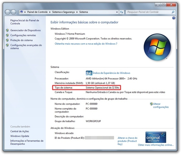 Na janela que se abre são encontradas várias informações. Na seção “Sistema”, porém, está a que vocêprocura. Na opção “Tipo de sistema” é possível verificar se o seu é de 32 ou 64 bits: