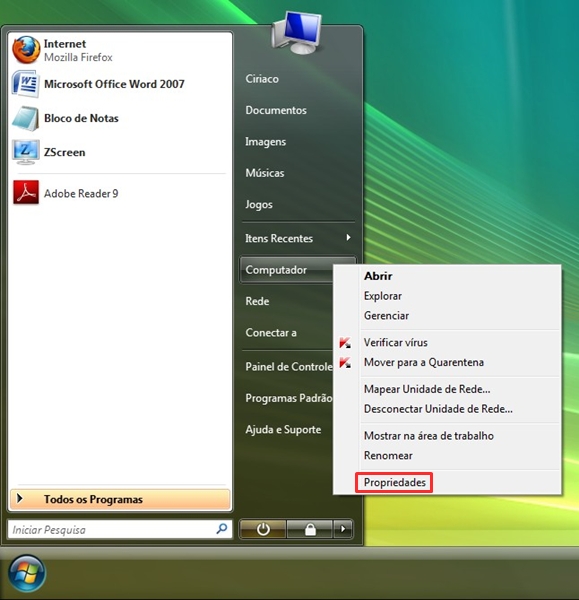 O procedimento nos Windows 7 e Vista é exatamente o mesmo, portanto, se você é usuário de um dos dois faça o seguinte: vá ao Menu Iniciar e clique com o botão direito do mouse sobre a opção “Computador”.